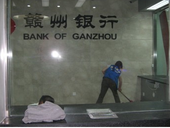 迪邦保潔公司人員正在為“贛州銀行”做保潔開荒、清洗玻璃。